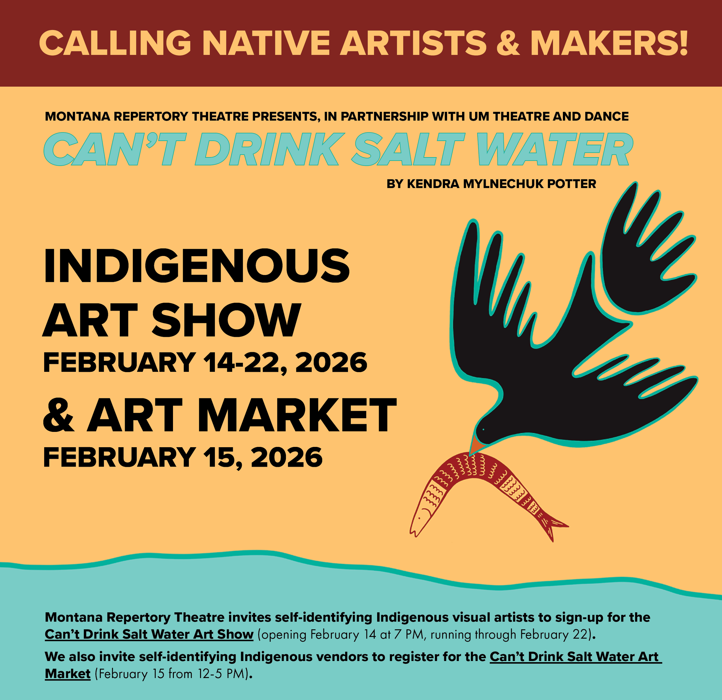 Montana Repertory Theatre invites self-identifying Indigenous visual artists to sign-up for the Can’t Drink Salt Water Art Show (opening February 14 at 7 PM, running through February 22). We also invite self-identifying Indigenous vendors to register for the Can’t Drink Salt Water Art Market (February 15 from 12-5 PM).